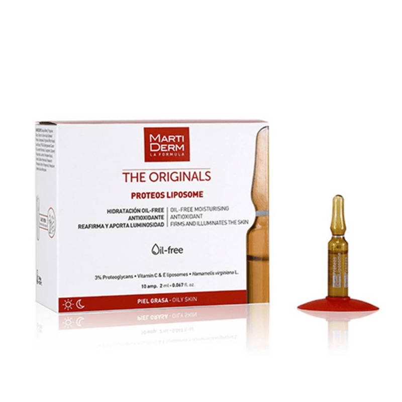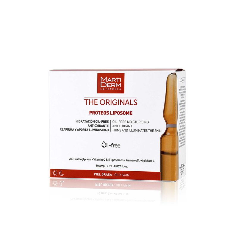 Proteos Liposome es un tratamiento facial anti edad sin aceite indicado para pieles sensibles, mixtas y grasas. Su textura ligera y fresca es ideal para este tipo de pieles, dejando una sensación de piel suave no grasosa. La Hamamelis virginiana, es uno de los principales activos, este ingrediente tiene un efecto astringente, que cierra los poros y tonifica la piel. Además, los proteoglicanos dan firmeza a la piel y retienen el agua, reduciendo la deshidratación cutánea. Estas ampollas están enriquecidas con Vitaminas C y E liposomadas, que actúan como antioxidantes y neutralizan los radicales libres de la exposición solar. Contiene 10 ampollas.