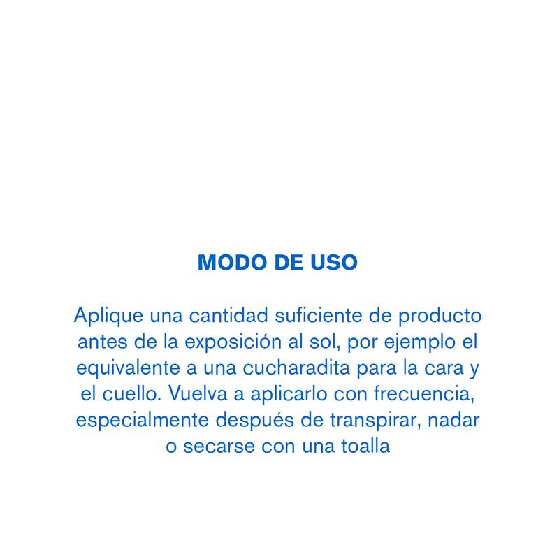 Aplique una cantidad suficiente de producto antes de la exposición al sol, por ejemplo el equivalente a una cucharadita para la cara y el cuello. Reducir esta cantidad disminuye el nivel de protección.