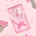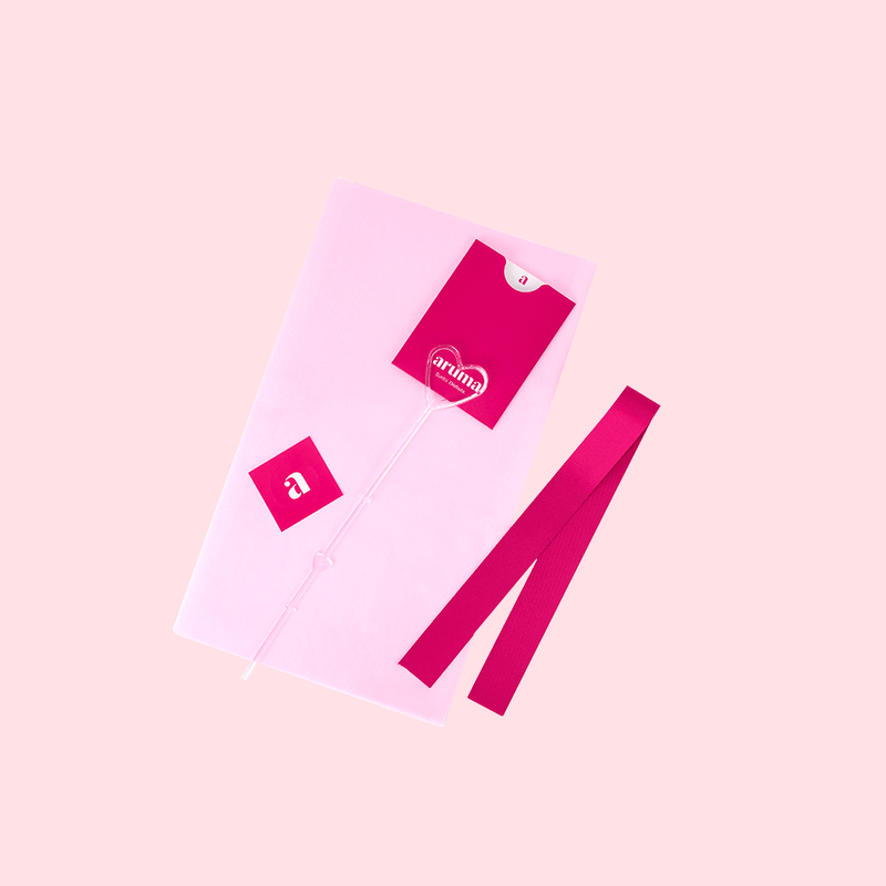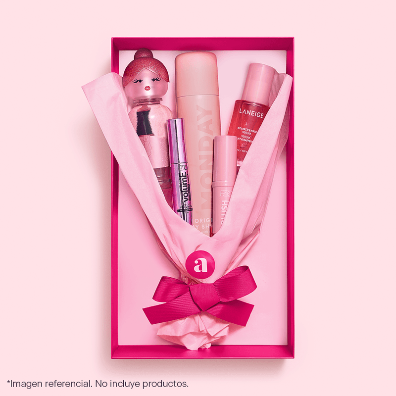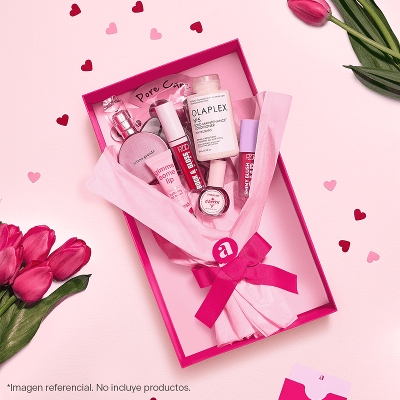 Esta caja incluye: Papel de seda rosa, un sticker, un lazo cinta, un parante de acrílico, una tarjeta y un sobre para dedicatoria. No incluye productos.