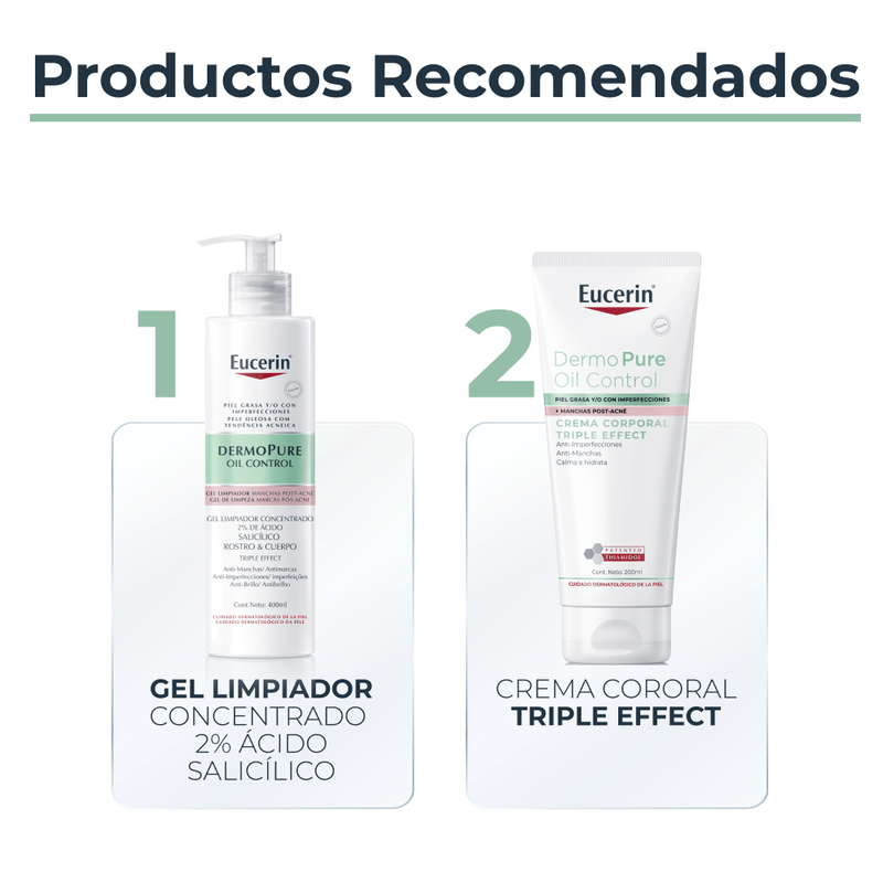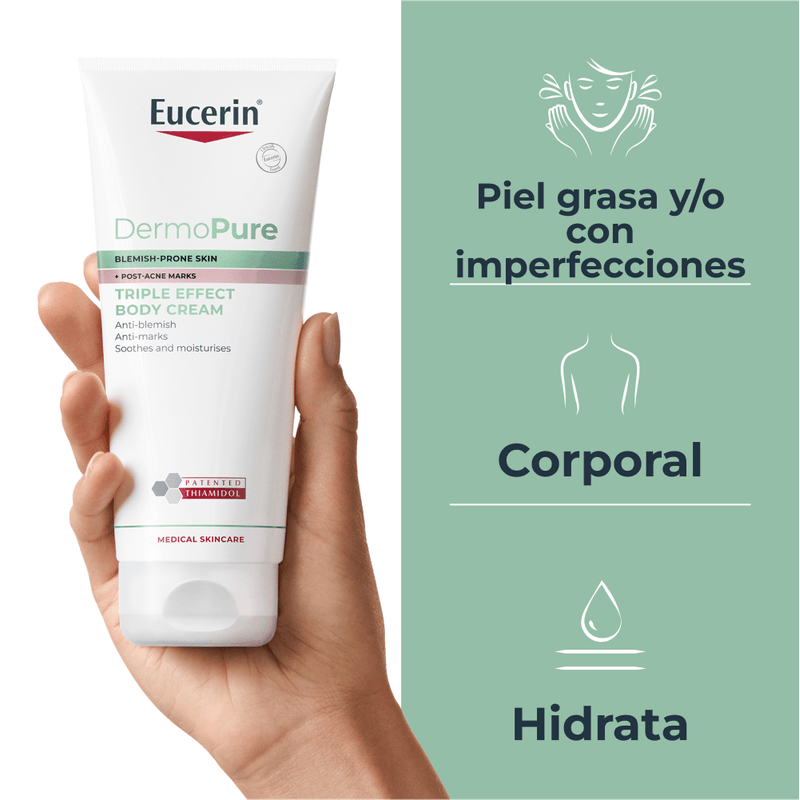 Eucerin Dermopure Crema Corporal probada clínicamente con Ácido Salicílico y Thiamidol® Patentado para reducir eficazmente las imperfecciones persistentes y las manchas de acné en el cuerpo, incluyendo áreas como el pecho, la espalda y los hombros, mientras calma e hidrata la piel.