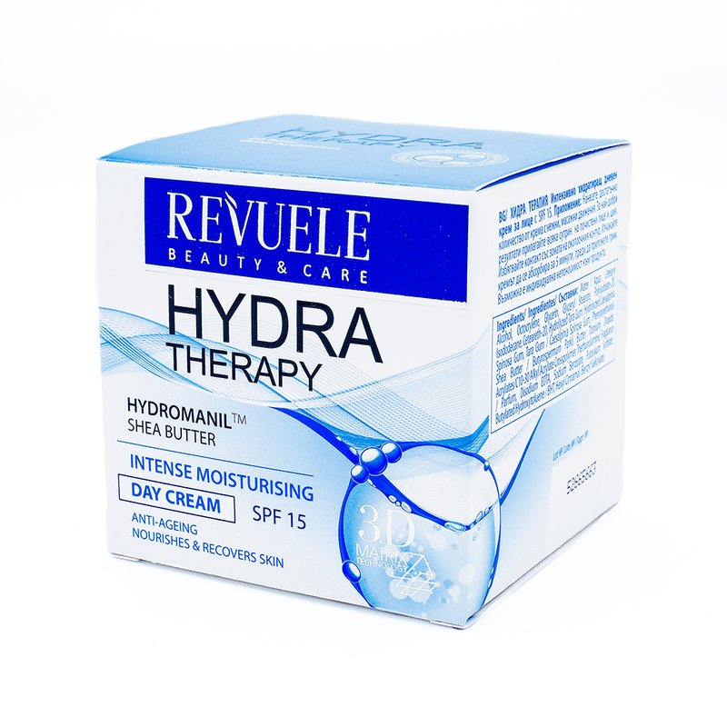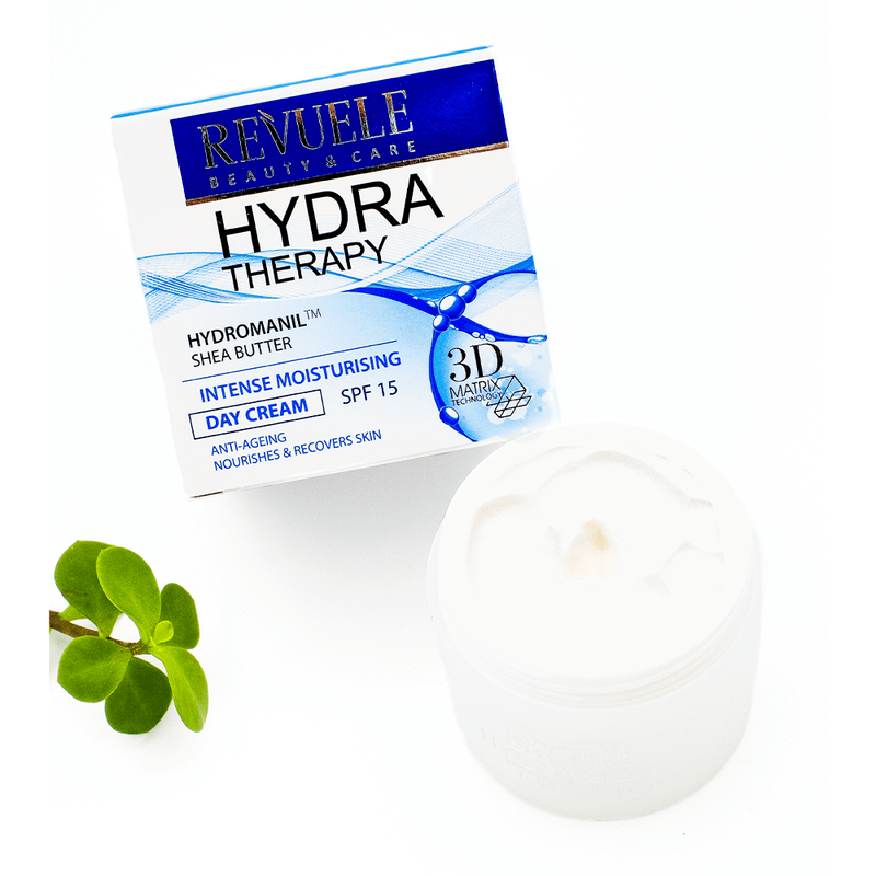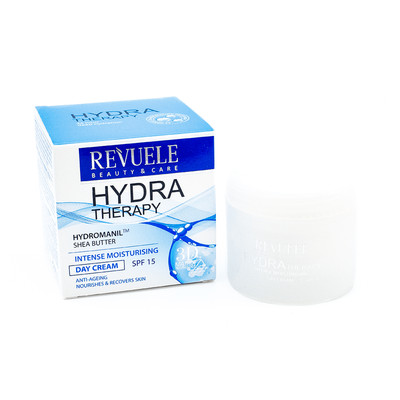 Hydra-Therapy Crema de día Hidratante SPF15 de Revuele contiene unos activos combinados especialmente formulados para lucir una piel más tersa, suave y con vitalidad, además de contener factor de protección SPF15 para proteger la piel de los daños solares.