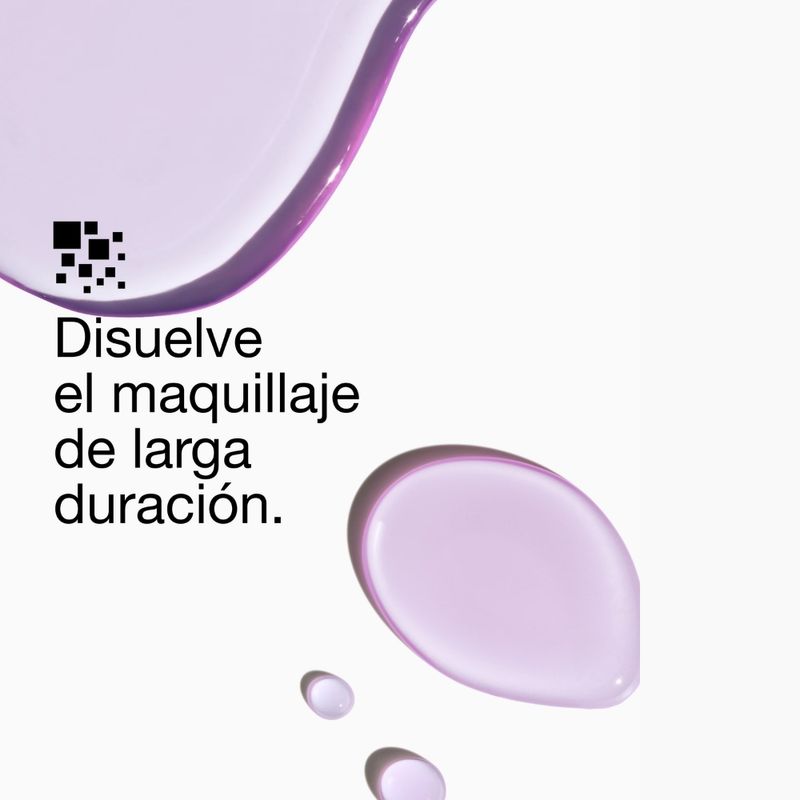 Desmaquillante líquido de doble acción que debilita y acelera la salida de fórmulas de maquillaje para ojos y labios de larga duración.