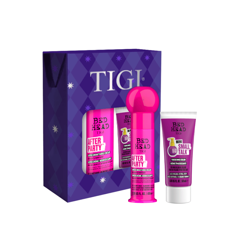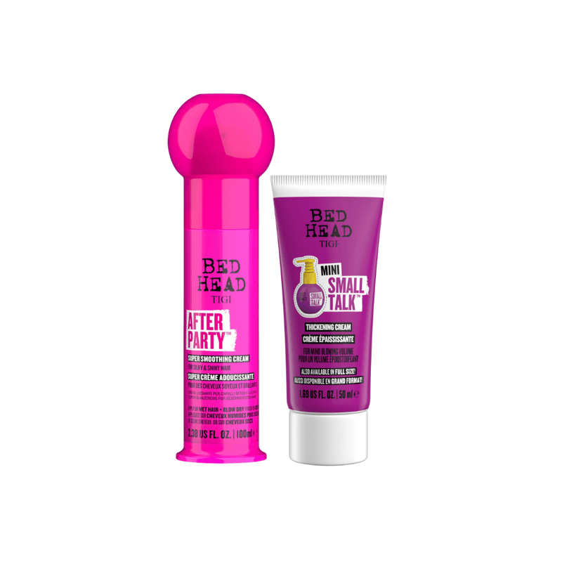 Dos esenciales de styling profesional. After Party (100ml) es una crema suavizante que controla el frizz, elimina el encrespamiento y deja el cabello con un acabado brillante y sedoso. Mini Small Talk (50ml) aporta volumen, cuerpo y definición al cabello, dejándolo con textura natural y manejable. Ideal para lograr un look pulido y con movimiento