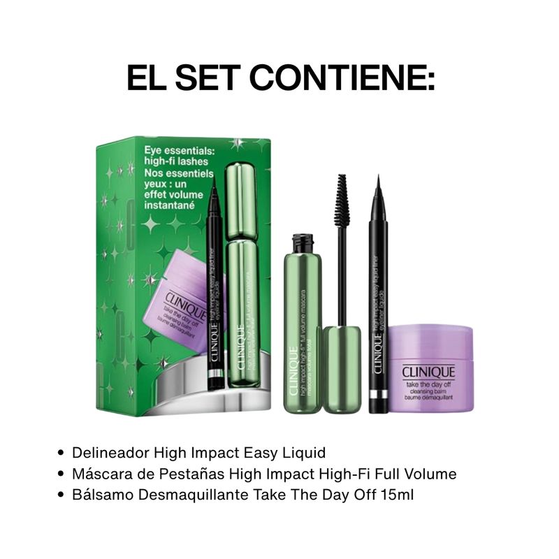 El set contiene: Delineador High Impact Easy Liquid Máscara de Pestañas High Impact High-Fi Full Volume Bálsamo Desmaquillante Take The Day Off 15ml
