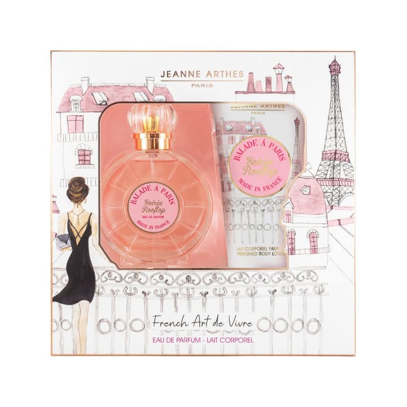 Ligeramente especiado, es sublimado por notas golosas y sensuales de Pachulí y Vainilla. Contiene un Balade a Paris Soiree Rooftop Edp 100 ml y un Body Lotion 150 ml.
