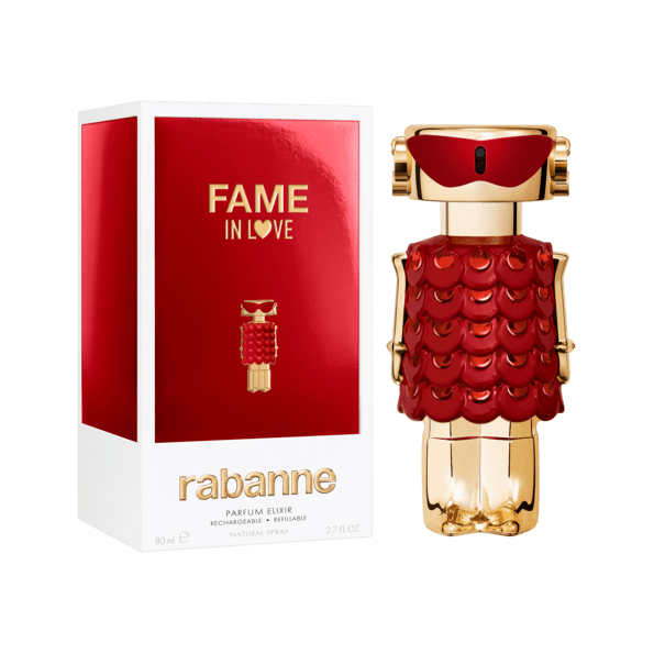 Descubre la fragancia femenina más deliciosa de FAME con el inconfundible toque Rabanne: FAME IN LOVE Parfum Elixir. Un nuevo lenguaje del amor para la chica Rabanne más juguetona, realzado por una nota de fresa súper jugosa. Porque el amor es rojo.