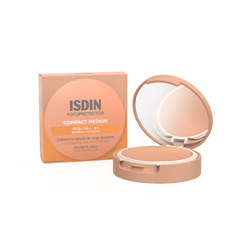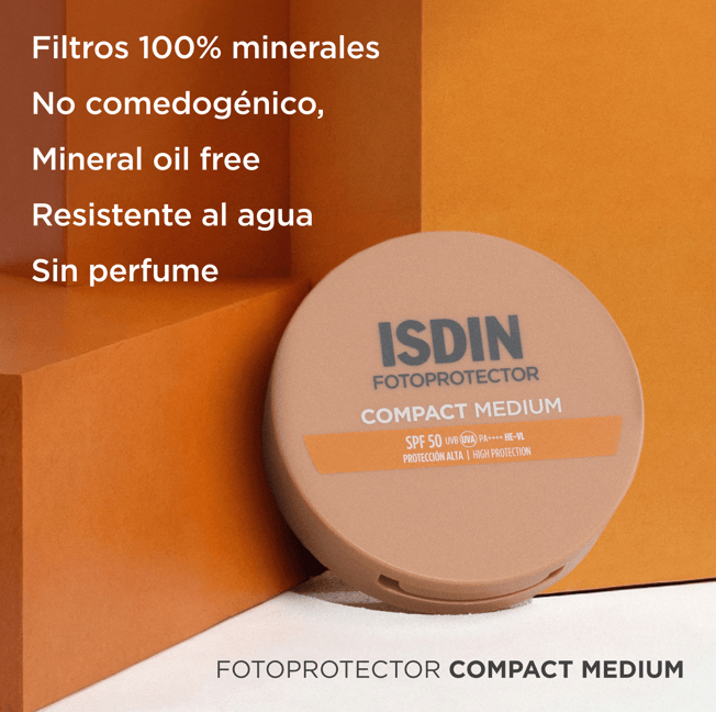 Luce un tono de piel natural y unificado con Compact Medium SPF 50, el maquillaje compacto de uso diario con filtros 100% minerales y color en tono medio que proporciona una alta protección. Cubre imperfecciones y aporta una cobertura mate de larga duración.