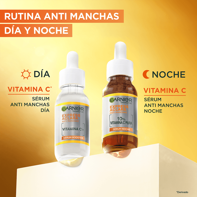 Con el nuevo Garnier Express Aclara Booster Sérum Noche con 10% de vitamina C pura reduce las manchas durante la noche y luce una piel visiblemente más suave, radiante, revitalizada y descansada desde la primer mañana. Di adiós a las manchas, a la piel apagada y a las líneas finas. Fórmula vegana, aprobado por Cruelty Free International por el programa de Leaping Bunny ¡Despierta con una piel más luminosa día tras día! Aprobado por Cruelty Free International