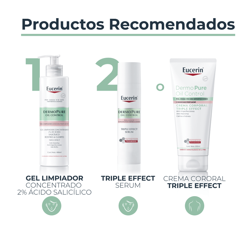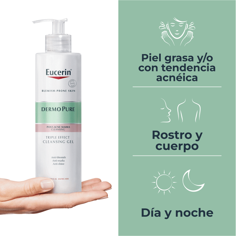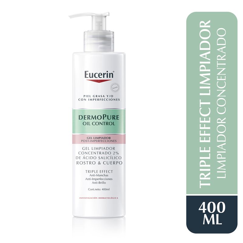 Eucerin Dermopure Gel limpiador concentrado con Ácido Salicílico al 2% te ayuda a vencer por fin las imperfecciones y sus manchas gracias a 3 factores clave: