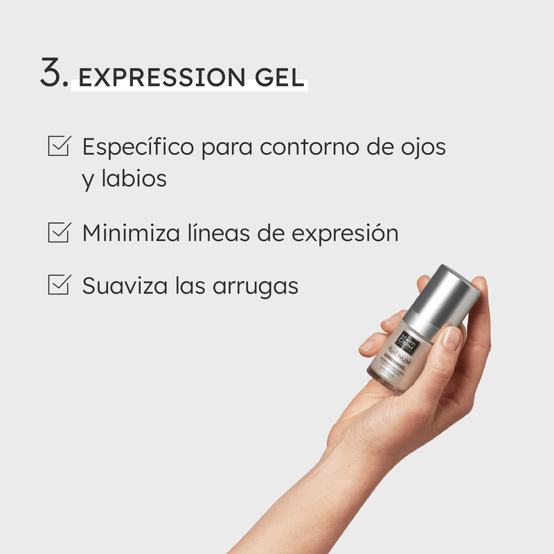 La combinación de activos en este producto específico para las arrugas de expresión consigue un triple efecto 3 R: Relaja la piel (gracias a su potente acción descontracturante), Redensifica(hidratación, en profundidad y en superficie) y Rellena las arrugas. El octapéptido, acetyl octapeptide‐3, es un análogo al extremo Nterminal del SNAP‐25. Compite con la proteína natural por una posición en el complejo SNARE, de modo que las vesículas sinápticas no liberan Acetilcolina de manera eficiente con lo que la contracción