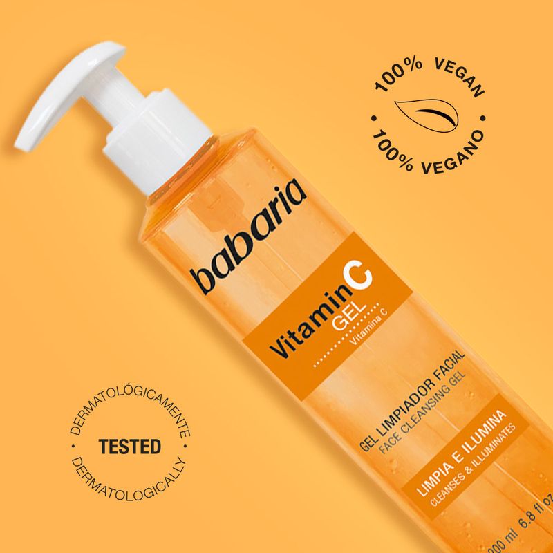Babaria Gel Limpiador Facial Vitamina C 200 ML, limpia, ilumina y desmaquilla en profundidad.Gracias a la combinación de la Vitamina C y los AHA'S tonifica la piel y permite tener un rostro más luminoso.