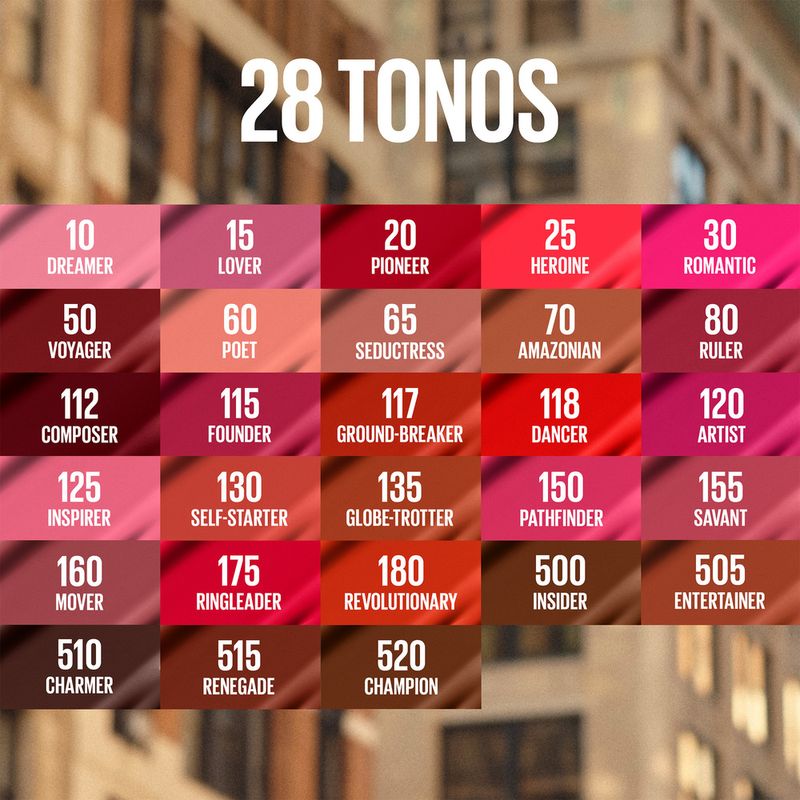 Labial líquido estilo tinta SuperStay Matte Ink Liquid Lipstick te brinda un acabado mate impecable en una gama de tonos supersaturados. Pinta tus labios con un tono mate líquido saturado que dura hasta 16 horas y no se transfiere. La tinta para labios SuperStay Matte Ink™ cuenta con un exclusivo aplicador estilo flecha para brindarte una aplicación más precisa, y está disponible en una gama de tonos supersaturados. MODO DE USO: Paso 1: Aplica el color labial líquido desde el centro del labio superior hacia los extremos, siguiendo el contorno de la boca. Paso 2: Deslízalo por todo el labio inferior.