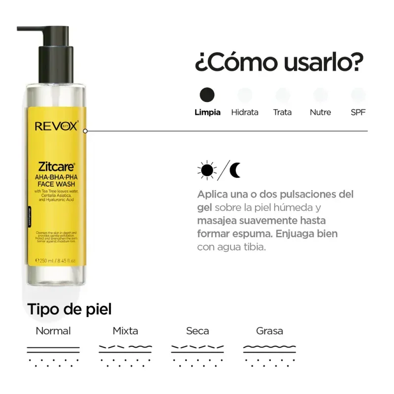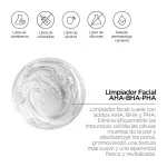 El gel limpiador facial crea una espuma suave que limpia la piel en profundidad y proporciona una exfoliación delicada. La mezcla de AHA, BHA y PHA ayuda a eliminar las células muertas de la piel y la contaminación diaria que puede obstruir los poros y causar irritación, dejando la piel más suave y luminosa. El Extracto de Árbol de Té en la fórmula tiene propiedades calmantes y equilibrantes. La Centella Asiática contribuye a proteger y fortalecer la barrera de la piel contra la pérdida de humedad. El Ácido Hialurónico y la Glicerina hidratan la piel, dejándola más suave y tersa.