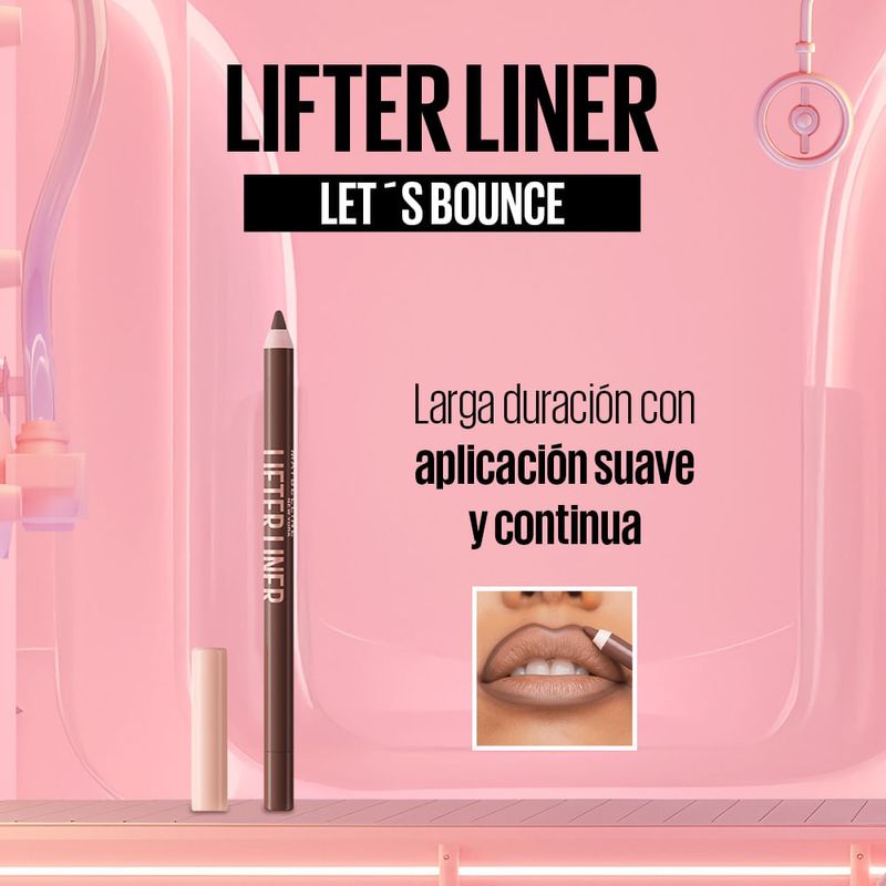Delineador De Labios Maybelline Lifter Liner Lets Bounce : El delineador de labios que te brinda color duradero y una aplicación suave. Olvídate de los delineadores que resecan o tiran de la piel, la fórmula cremosa e hidratante de Lifter Liner se desliza sin esfuerzo, definiendo tus labios con precisión y preparándolos para tu labial favorito. Su textura confortable se mantiene en su lugar durante horas, evitando que el color se corra o se desvanezca. Elige entre 10 tonos diseñados para complementar y realzar la gama de colores de tu Lifter Gloss favorito, creando un look de labios perfecto que dura todo el día.
