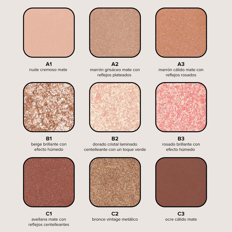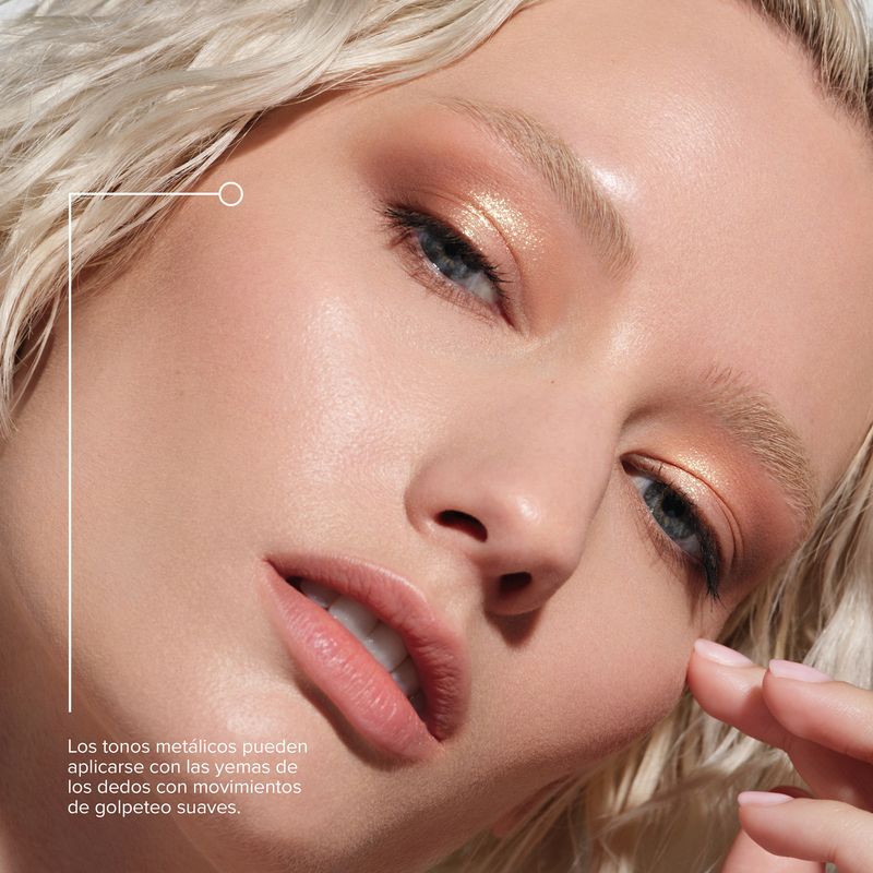 Usa las sombras de ojos mate y metálicas para iluminar . Usa las sombras de ojos neutras, mate y cálidas para contornear y definir, y las sombras de ojos metálicas, cálidas y frías, para acentuar.