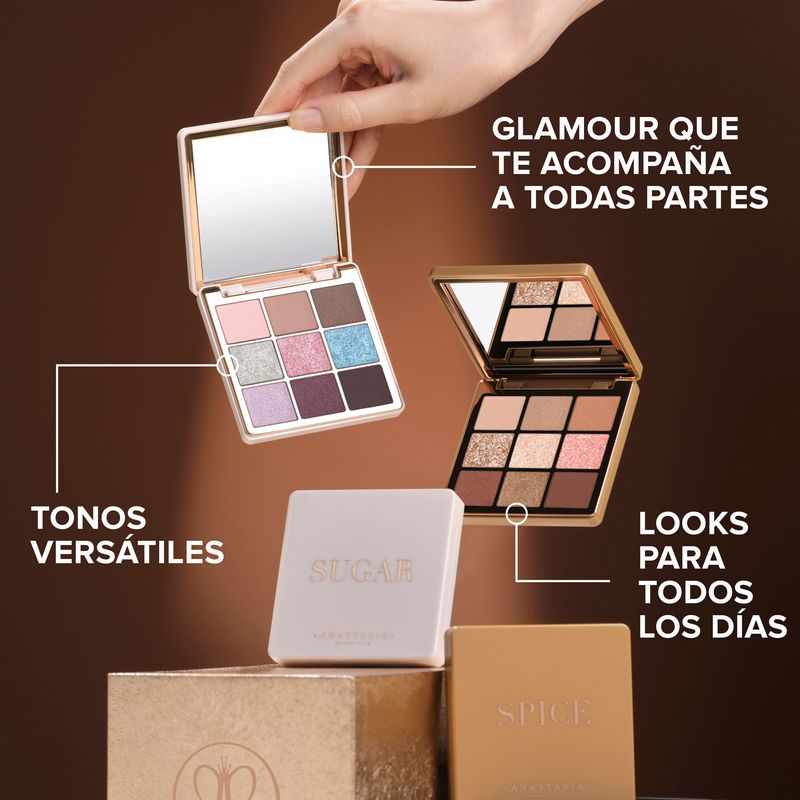La minipaleta de sombras de ojos Spice de Anastasia Beverly Hills contiene 9 tonos de alta pigmentación, desde neutros cálidos hasta dorados brillantes con acabados mate y metálicos . Esta colección esencial de mini sombras de ojos presenta la fórmula altamente pigmentada y fácil de difuminar de ABH y ofrece una gama de colores versátil para crear looks de ojos desde sutiles hasta dramáticos .