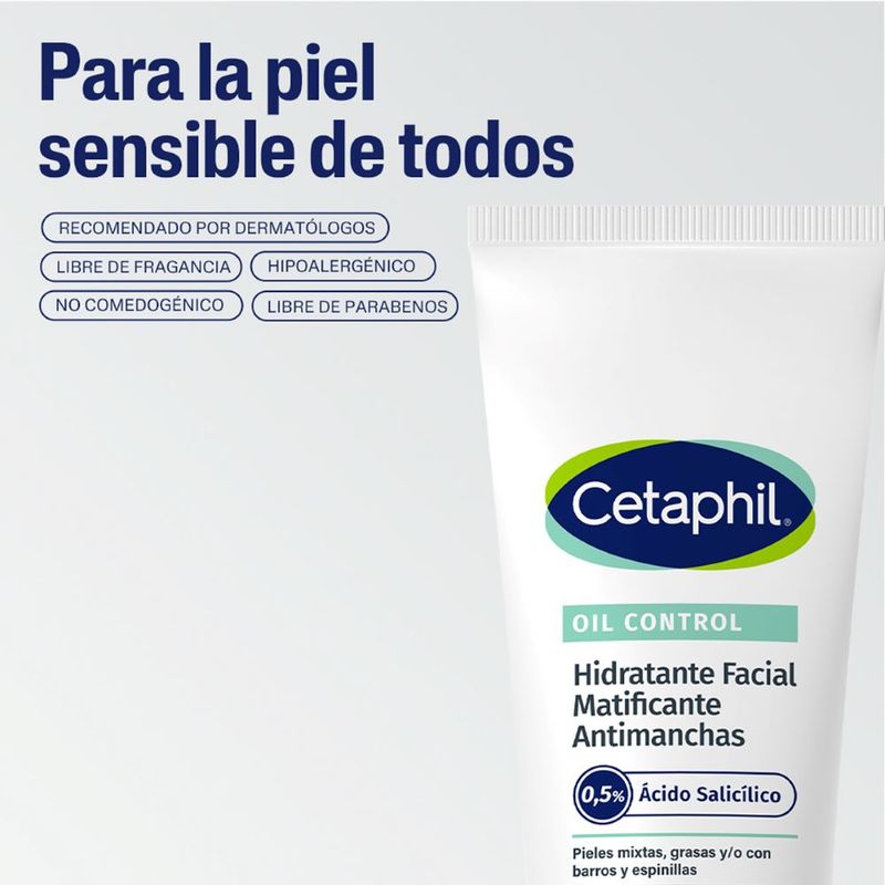 Cetaphil oil control hidratante facial antimanchas , mejora la uniformidad de la piel y reduce visiblemente la apariencia de los poros. Formulado con ácido salicilico y bisabolol componentes que ayudan a reducir las imperfecciones, los puntos negros y puntos blancos. Restricciones y/o contradicciones: Advertencias y precauciones: Uso externo. En caso de irritación, sarpullido o alguna otra reacción desfavorable, suspenda su uso y consulte al médico. Evite el contacto con los ojos. Mantener el producto fuera del alcance de los niños.