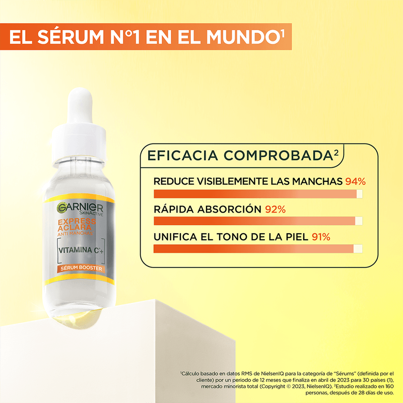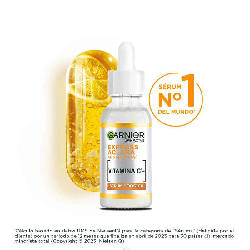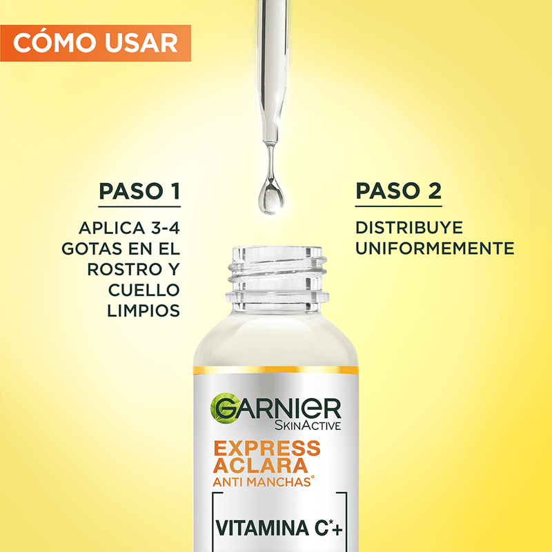 Sérum Antimanchas Garnier Express Aclara Vitamina C 30 ml: El booster sérum anti manchas de Express Aclara tiene activos concentrados para resultados rápidos y una textura ligera y de toque seco.