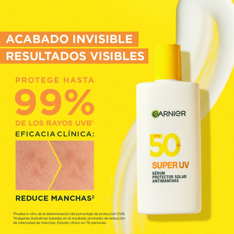 Protector Solar Skin Garnier Super Uv Fluido Invisible Fps 50+: Garnier Super UV Sérum, Protector Solar Antimanchas, Acabado invisible antioleosidad, FPS50+ UVA/UVB, Protege del daño solar y Reduce manchas, Rostro y Cuello, para todos los tipos de piel, Cruelty Free, Vegano, 40ml.
