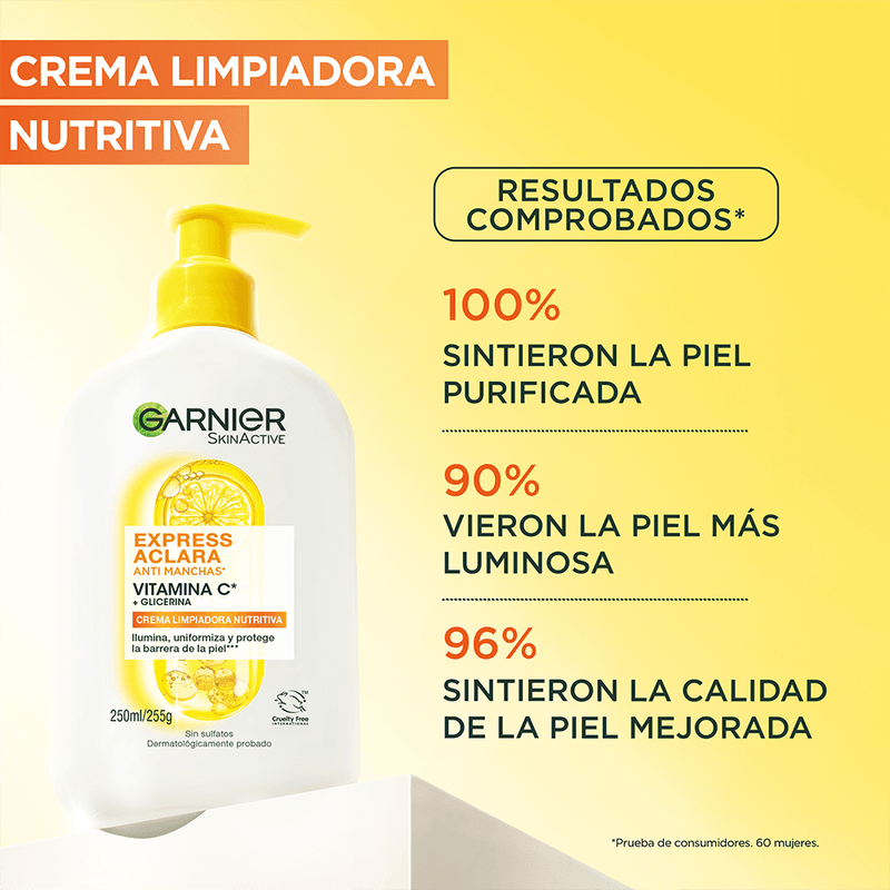 Garnier Express Aclara Anti Manchas Crema Limpiadora Nutritiva Vitamina C 250ml: Garnier Express Aclara Anti Manchas Vitamina C* Crema Limpiadora Nutritiva, protege la barrera de la piel, limpia, nutre y uniformiza.