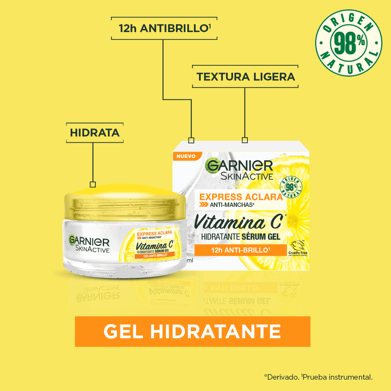 Hidratante En Gel Express Aclara Skin Garnier 50 ml: Crema Gel Hidratante Anti Manchas Express Aclara, ideal para pieles mixtas a grasas. Su fórmula vegana con textura gel ultra ligera, enriquecida con Vitamina C, reduce las manchas e hidrata la piel por 48 horas manteniendo controlado el brillo en la piel. La crema se absorbe rapidamente dejando la piel hidratada, radiante, suave y sin sensación grasosa. Aplica dia y noche uniformemente en el rostro y cuello con movimientos circulares luego del serum. Evita el contorno de ojos. *Todos los productos de Garnier estan oficialmente aprobados por Cruelty Free International, bajo el programa Leaping Bunny.