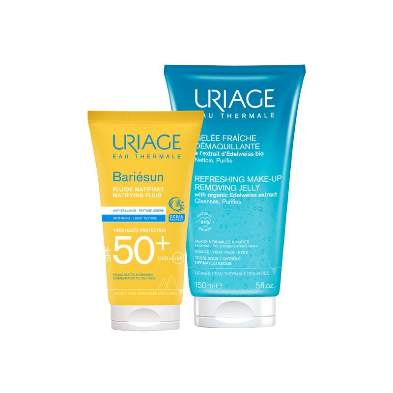 Limpia, hidrata y protege tu piel con el Gel Desmaquillante Uriage y el Bariésun Fluido Matificante SPF50+, ideal para un acabado mate y cuidado diario.
