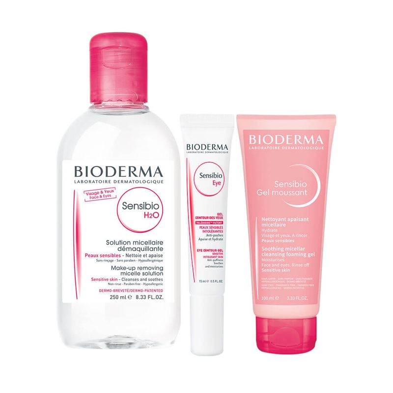 El Pack Rutina Sensibio ideal para piel sensible incluye: 1 Agua Micelar Sensibio H2O 250ml + 1 Gel Contorno de Ojos Sensibio 15ml + 1 Gel Limpiador Sensibio Gel Moussant 100ml