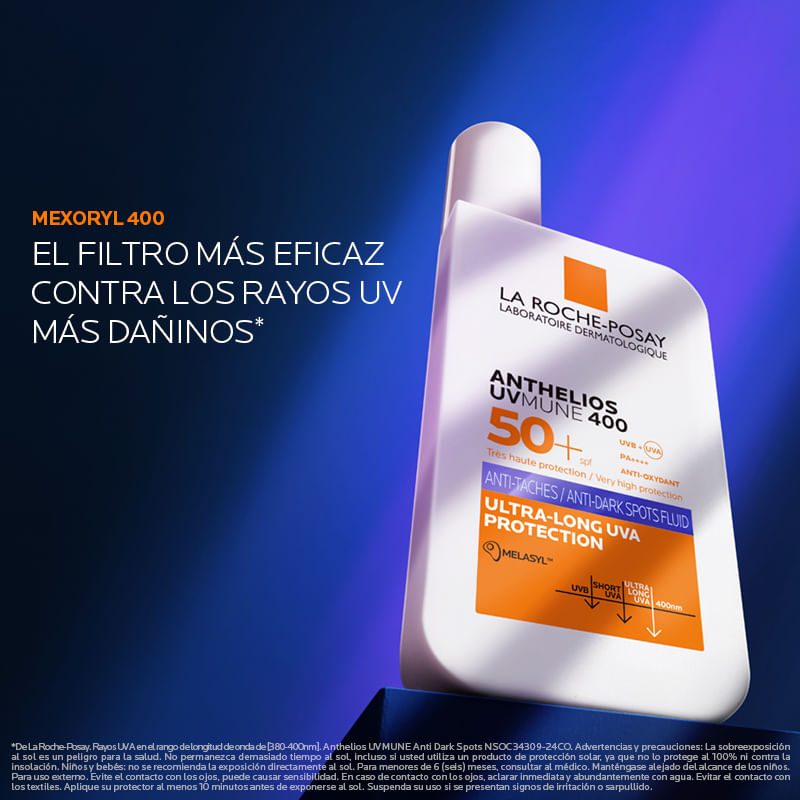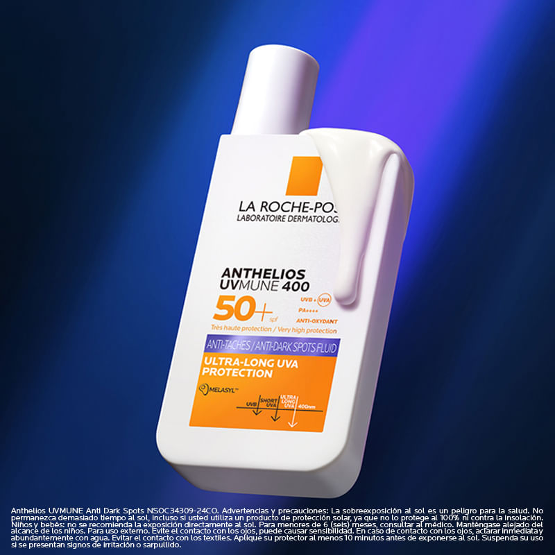ANTHELIOS UVMUNE 400 ANTI MANCHAS es un protector de muy alta protección de amplio espectro UVB/UVA. Ayuda a prevenir los daños celulares. Mejora el tono desigual de la piel hasta las manchas oscuras. Apto para piel sensible. Sin perfume.