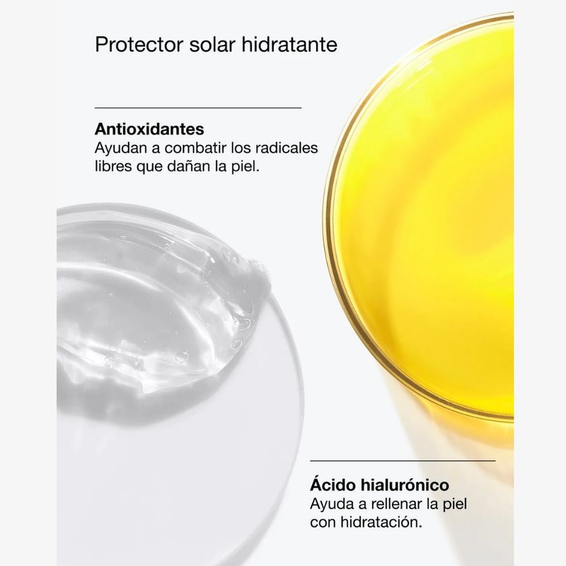 Bloqueador facial que aporta hidratación instantánea y prolongada mientras protege la piel contra el daño solar y los signos de envejecimiento prematuro. Formulado para un uso diario con textura ligera y acabado confortable. Acabado invisible y sin residuos blancos.