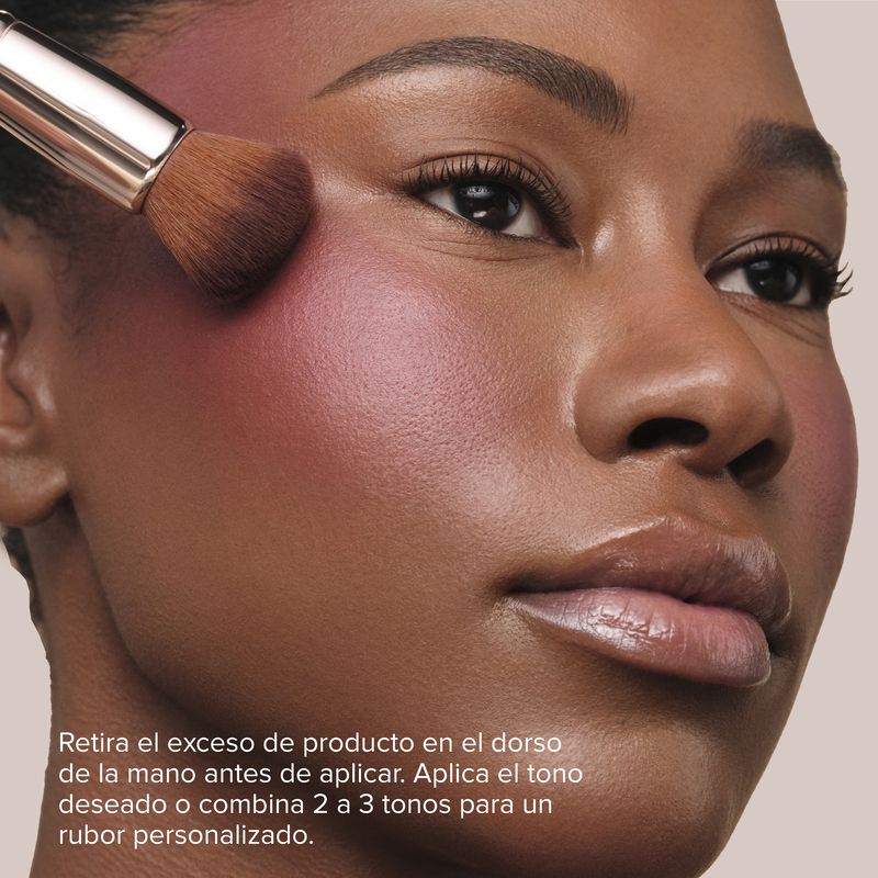 1 TONO: Para un rubor sutil, aplique el tono deseado en el centro de las mejillas y difumínelo hacia arriba.