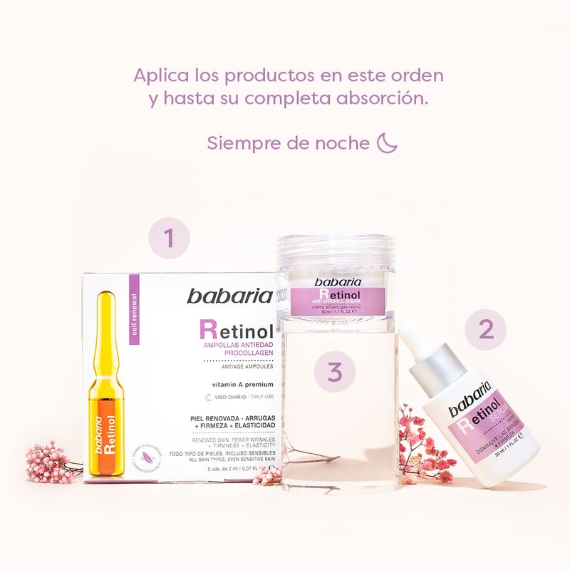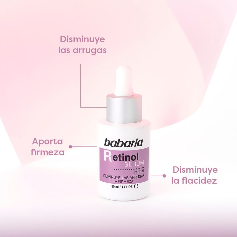 En Babaria hemos utilizado un retinol de origen natural a base de frutas y verduras que, gracias a sus propiedades, tiene un efecto determinante en la lucha contra el envejecimiento, obteniendo así una piel más firme y elástica. De esta forma, combate contra las arrugas en ojos, barbilla, patas de gallo, así como también iguala el tono de la piel mejorando los efectos de pigmentación y evitando la síntesis de melamina.