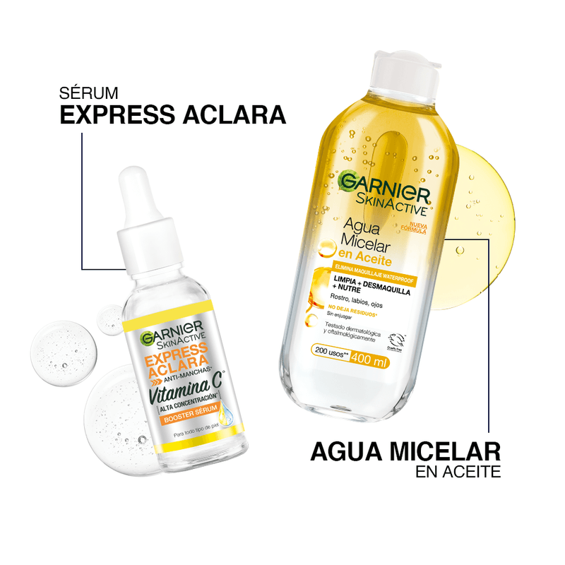 Sérum Antimanchas Garnier Express Aclara Vitamina C 30 ml: El booster sérum anti manchas de Express Aclara tiene activos concentrados para resultados rápidos y una textura ligera y de toque seco.