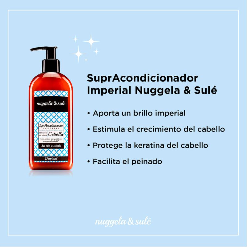 El único acondicionador del mercado que no engrasa al contacto con el cuero cabelludo, por lo que se puede aplicar desde la raíz a las puntas. Cuenta con doble acción: terapéutica y estética ya que aporta nutrientes al folículo piloso para fortalecerlo y, a la vez, protege, nutre y mejora el brillo del cabello desde la raíz a las puntas. El SuprAcondicionador Imperial con vitaminas y activos que fortalecen el cabello, protegen las fibras de keratina obteniendo un cabello fácil de peinar y con un Brillo Imperial.