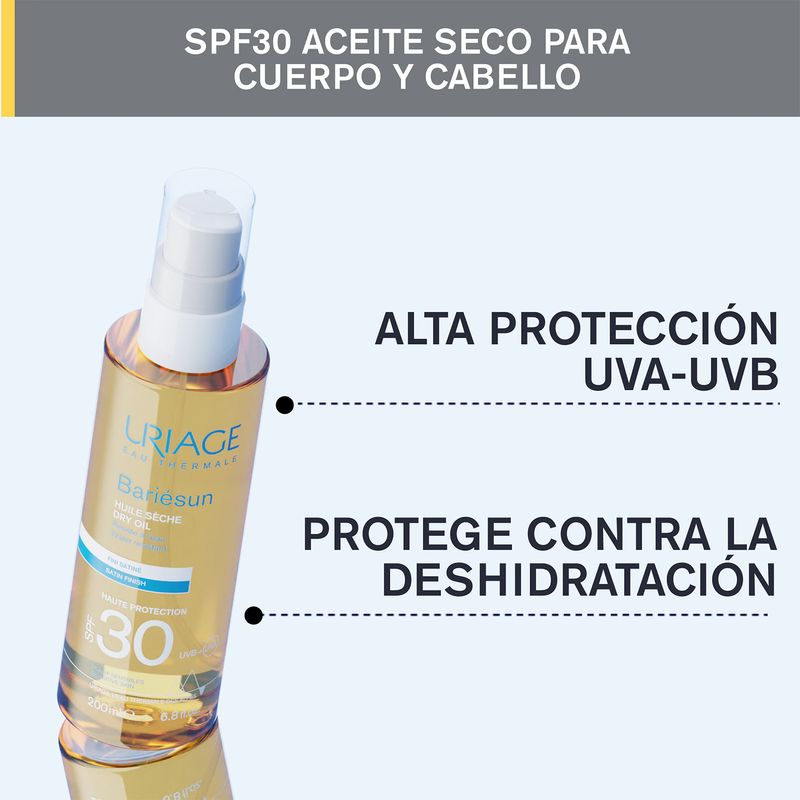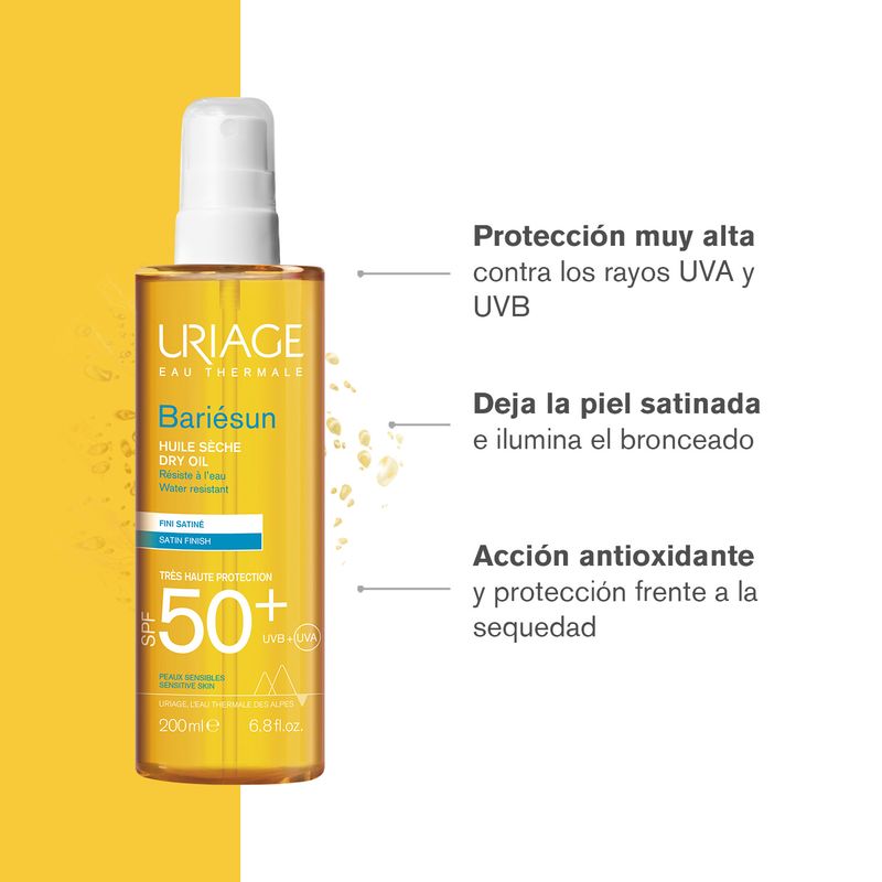 Bariésun combina un complejo de filtros de muy alto rendimiento y las propiedades del Agua Termal de Uriage para proteger la piel y prevenir los daños celulares causados por los rayos UVA y UVB. Este aceite seco deja la piel satinada e ilumina el bronceado gracias a su textura fundente y no grasa. También puede utilizarse en el cabello, ya que lo protege contra la sequedad y preserva su belleza natural.